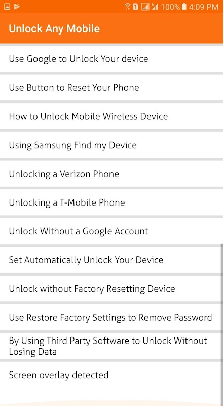 Unlock any device Techniques 2018 to secure data or preventing unauthorized use of data. One method to protect your phone data is to lock your phone screen by pattern, pin or in other way like face recognition or fingerprint. This app provide to solution to problems of device locking or unlocking.