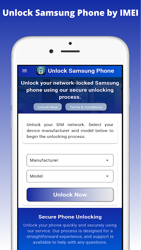 Menggunakan aplikasi ini, anda boleh membuka kunci telefon Samsung anda melalui IMEI. Perkhidmatan ini direka bentuk untuk mengalih keluar sekatan rangkaian sambil mengekalkan integriti perkakasan dan perisian peranti anda dan beroperasi dalam parameter undang-undang.