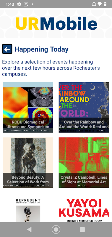 UR Mobile adalah aplikasi mudah alih rasmi bagi Universiti Rochester. Anda boleh menggunakan aplikasi sepanjang hari untuk mencari maklumat penting dan untuk memeriksa jadual bas dengan cepat, semak imbas acara, mencari direktori, perkhidmatan akses kecemasan, dan banyak lagi.