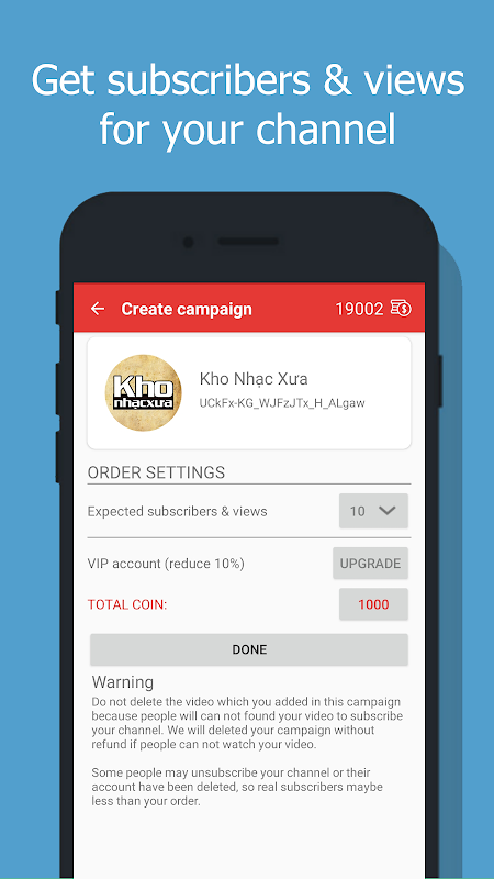 Anda akan mendapat 1000 pelanggan dan 10000 waktu menonton dengan cepat. Anda boleh menghidupkan pengewangan dalam masa yang singkat menggunakan aplikasi USub -Sub4sub.