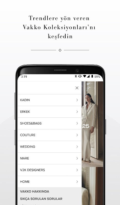 Anda boleh mengikuti semua koleksi Vakko, mencerminkan gaya abadi Vakko, melalui aplikasi mudah alih. Anda boleh mengikuti aliran musim ini dengan mengikuti semua bahagian yang menonjol dalam koleksi Vakko di sini. Vakko Monogramkoleksi, model kasut dan beg, tudung yang mengandungi tandatangan Vakko dan Couturemencerminkan keanggunan gaun malam sentiasa bersama anda dengan aplikasi mudah alih. Selain produk musim baharu, anda boleh melihat produk Vakko Outlet di sini.