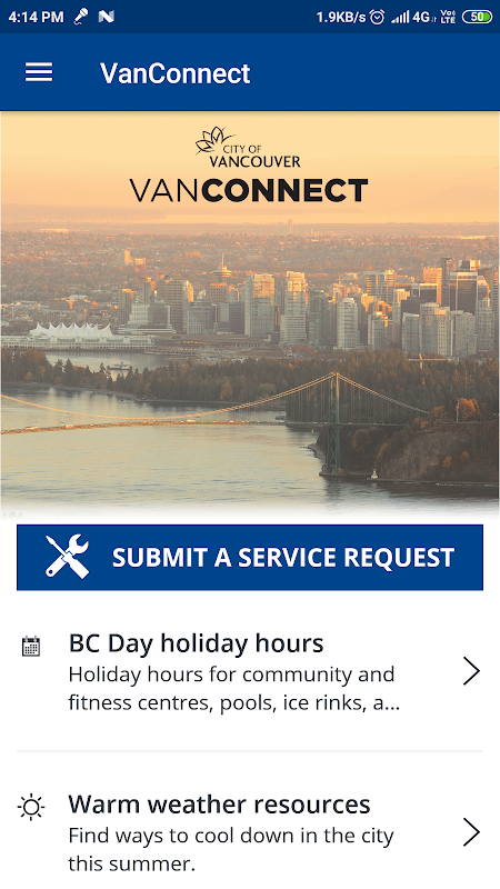 VanConnect allows you to request a service, get emergency updates, locate nearby City facilities on the go, or get quick access to City online services.