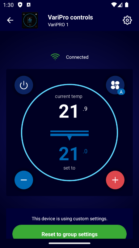 Termostat berbilang boleh dikawal daripada aplikasi. Termostat boleh dikumpulkan ke dalam zon yang membolehkan titik tetapan & pemilihan mod biasa untuk beberapa termostat. Termostat juga boleh diletakkan ke dalam mod kawalan tersuai untuk mengatasi tetapan zon.
