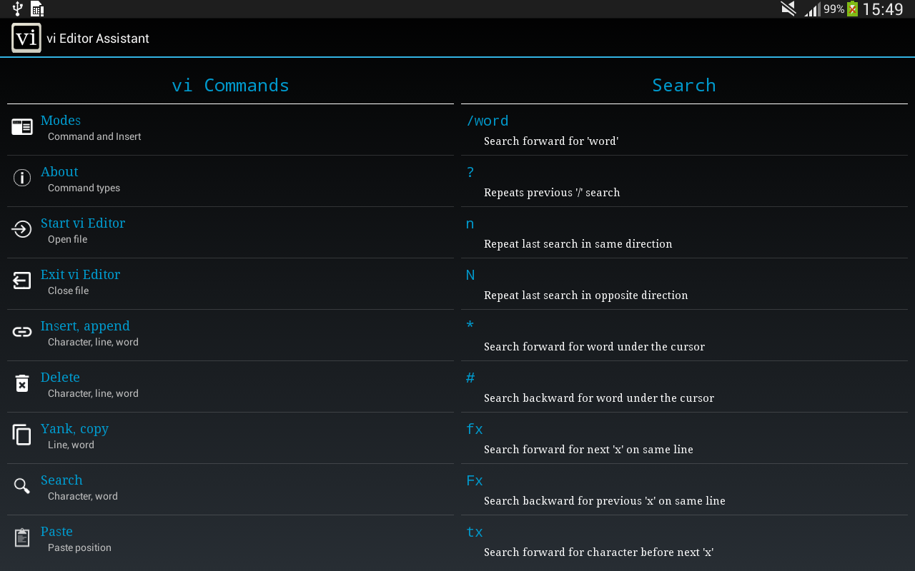Permohonan ini hanya merujuk kepada arahan yang paling biasa digunakan dalam vi Editor: ia tidak dapat mengawal editor dari peranti anda.