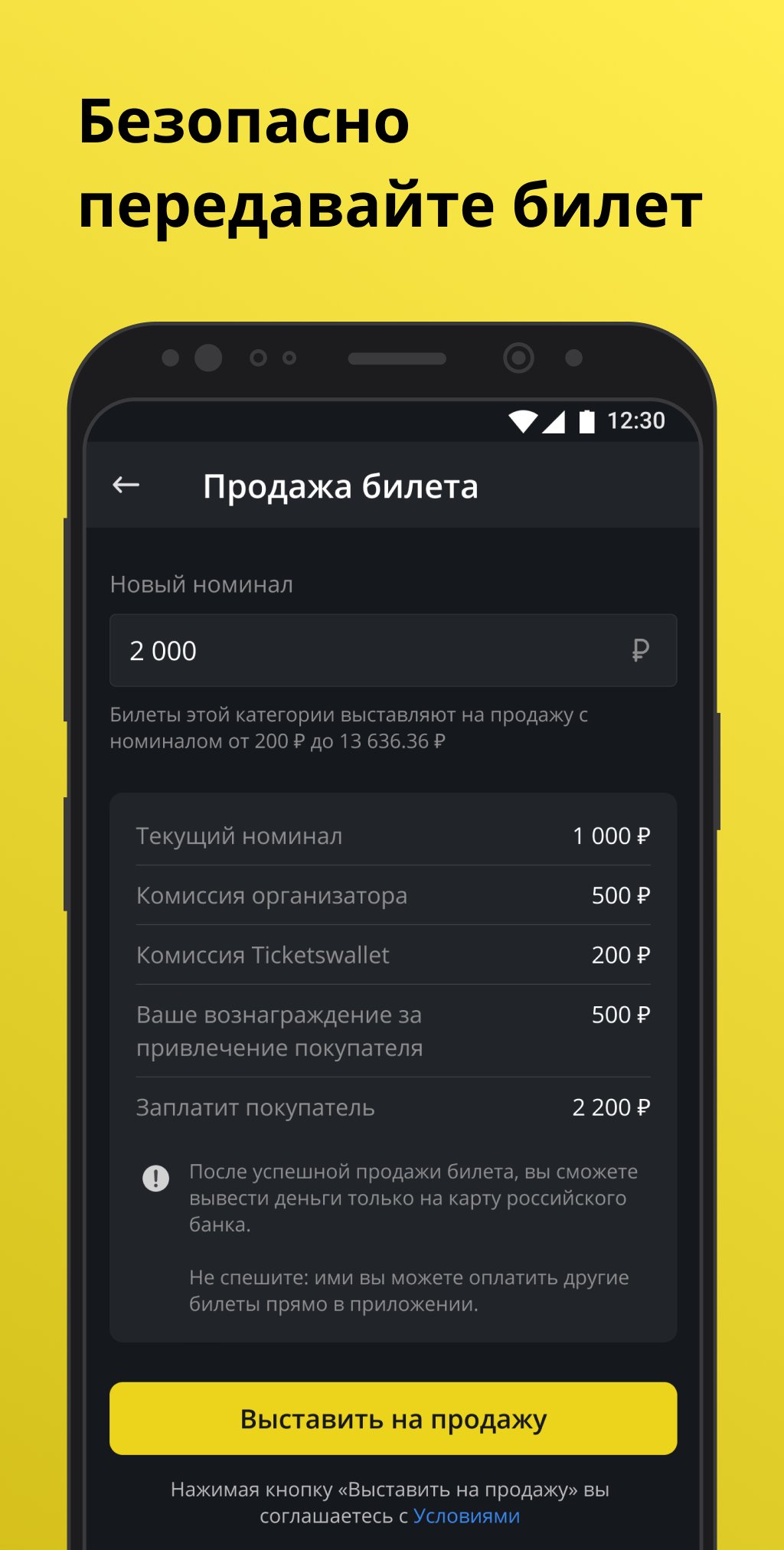 Tiada lagi pengumuman atau mesyuarat di pintu masuk dengan "tiket tambahan". Tidak boleh pergi ke acara itu? Beri dan jual tiket terus dalam apl: tetapkan harga anda dan wang itu akan serta-merta berada pada baki anda selepas transaksi selamat.
