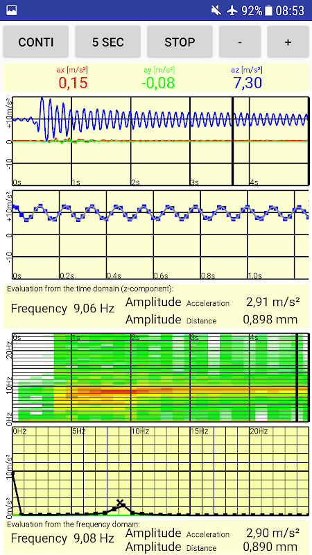 Die Beschleunigungen werden als Zahlenwert angezeigt. Die Abtastfrequenz der meisten Smartphones beträgt 50 Hz. Weicht die tatsächliche Abtastfrequenz um ± 1 Hz ab, dann erscheint die tatsächliche Abtastfrequenz (blinkend). Verschiedene Zeitangaben müssen dann entsprechend korrigiert werden. Die numerisch angezeigten Messwerte sind automatisch korrigiert.