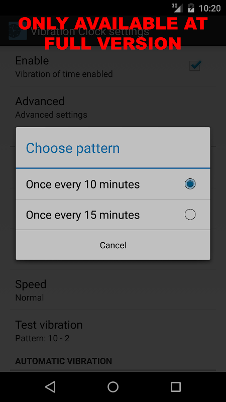 Jika anda ingin mengkonfigurasikan corak getaran sila membeli Getaran Jam (Full Version) http://market.android.com/details?id=at.idsoftware.vibrationclock