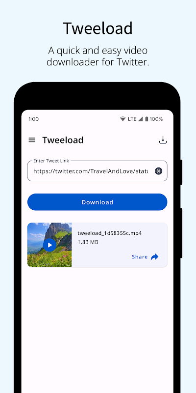 - Bagikan video ke aplikasi apa pun langsung dari aplikasi Tweeload.