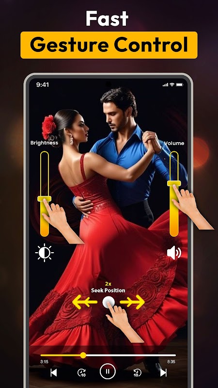 ✌ Kawalan Gerak Isyarat: dengan pemain media mengawal kelajuan main balik, kecerahan dan kelantangan dengan lembut di sepanjang ciri ke hadapan pantas, Undur, Main & Jeda Dengan gerak isyarat yang mudah.