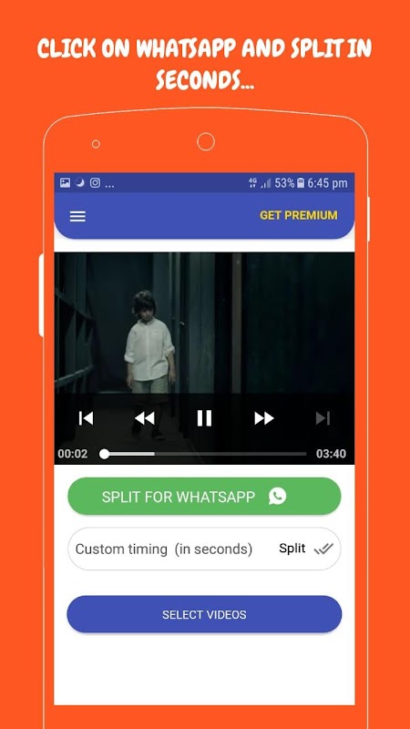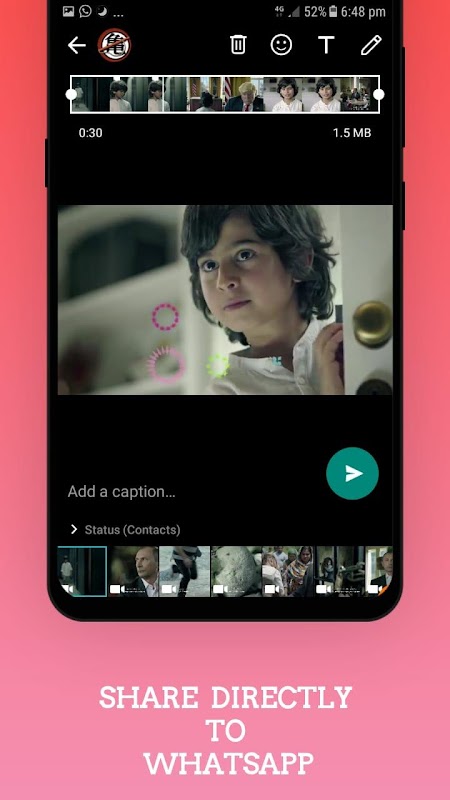 Splitter status video memungkinkan Anda membagi aplikasi Anda dengan WhatsApp Status, Instagram Stories, Facebook dan Sanpchat