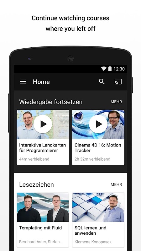 ● Browse and access the same courses as on the video2brain.com website.