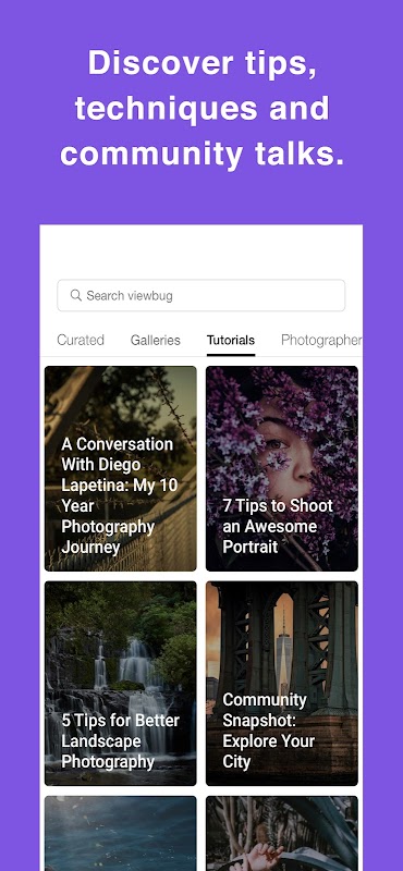 ViewBug adalah komunitas kontes foto paling menakjubkan di dunia untuk para profesional dan amatir. Jika fotografi adalah gairah Anda, ini adalah aplikasi foto gratis yang memungkinkan Anda menemukan fotografi, berbagi foto, dan menerima pengakuan dari fotografer dan juri lainnya.