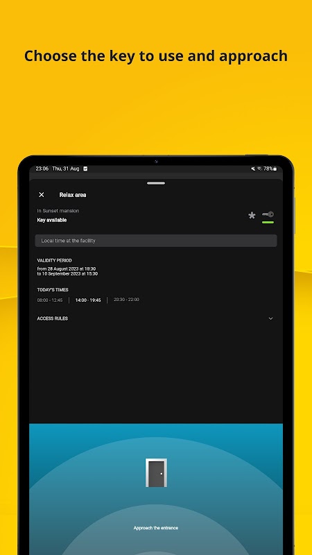 Akses kepada pembukaan/bilik diberikan oleh cincin kunci digital, diaktifkan dalam Aplikasi, selepas menerima e-mel jemputan dengan tarikh sah.