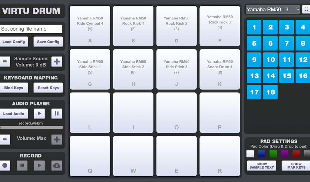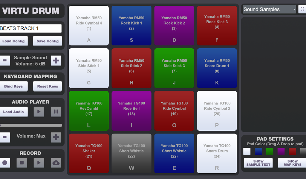 Have fun practicing and composing drum beats by using this online virtual drum pads with 396 unique drum sounds. If you’re looking to arrange cool rhythms for songs, this drum simulator is comes with sounds from different drum kit models, including Yamaha, Korg, Roland, Ensoniq, and many more. Once you’ve chosen a drum sound, simply select and drag it into a virtual drum pad. The drum pads can be color coded and labeled as needed. You can also control your drum pads by pressing keyboard buttons. It comes with a keyboard mapping feature if you want to change buttons for specific drum pads. Finally, you can record your drum beats, play them back