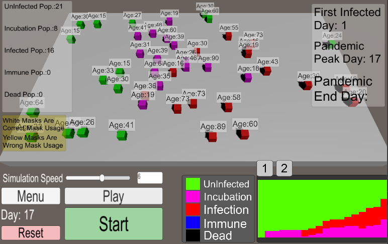 Anda boleh mengubah tetapan simulator virus dan periksa bagaimana pengaruhnya terhadap penyebaran. Perubahan: Penduduk, nisbah usia, penggunaan topeng yang salah dan betul, kemungkinan jangkitan virus dan seumur hidup virus. Dan periksa bagaimana ia akan mempengaruhi penyebaran virus di antara kubus lain (orang).