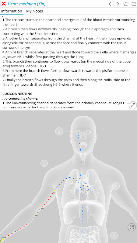 Setiap titik akupunktur, meridian (dan model anatomi) mengandungi penerangan teks penuh, yang boleh