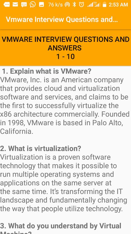 Vmware interview questions app contains the latest interviews questions you may likely be asked during interview. When we talk about Virtualization and cloud computing, VMware has position itself as the top leader in the cloud computing technology world. Vmware also also solutions in the field of network and desktop virtualization .When we talk about software technology, VMware has changed the tech world from physical to software-based virtual world. Using this