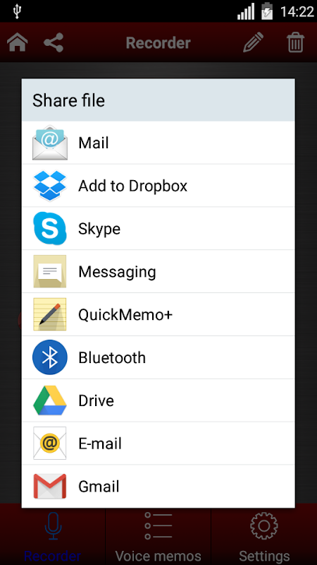 - hantar / kongsi rakaman melalui e-mel, sms, mms, facebook, whatsapp, dropbox, dll.