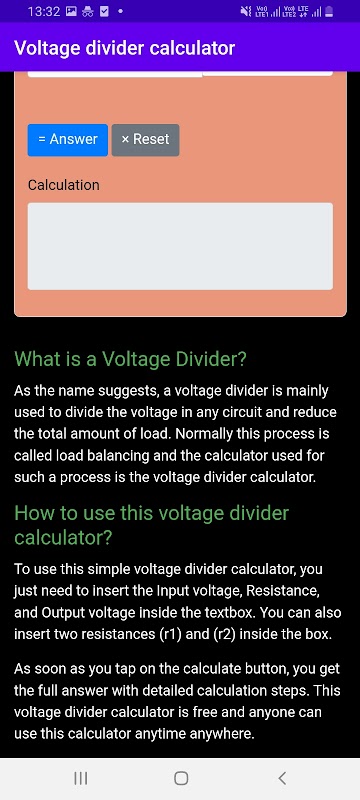 Untuk menggunakan aplikasi pengiraan pembahagi voltan mudah ini, anda perlu memasukkan mana-mana tiga input utama di dalam kawasan input. Sebaik sahaja anda memasukkan maklumat penting ini, anda perlu meneruskan dan mengetik butang kalkulator pembahagi voltan. Sebaik sahaja anda mengetik butang ini, pembahagi voltan akan dikira dan jawapannya akan ditunjukkan dengan semua langkah pengiraan.
