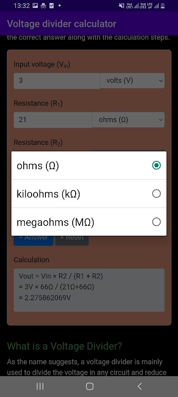 Apl kalkulator pembahagi voltan untuk mengira beban voltan dalam litar