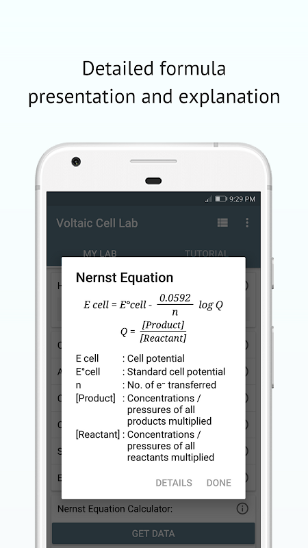 · Termasuk kalkulator persamaan Nernst yang mudah untuk pengiraan yang melibatkan sel volta bukan standard