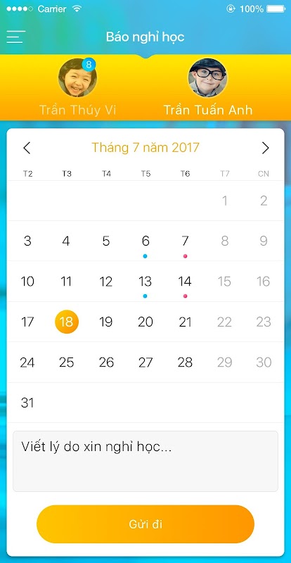 - Nhận thông báo nghỉ học từ phụ huynh và xác nhận nghỉ học qua ứng dụng. Các báo nghỉ được giáo viên xác nhận sẽ được ghi nhận là nghỉ học có phép và ngược lại.