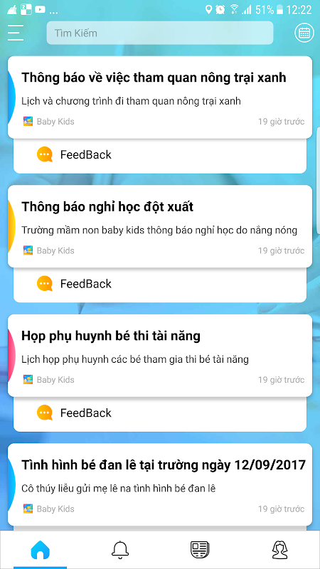 - Nhận thông báo từ trường học, thông báo được chia theo nhóm thông báo của trường, của lớp và thông báo cá nhân.