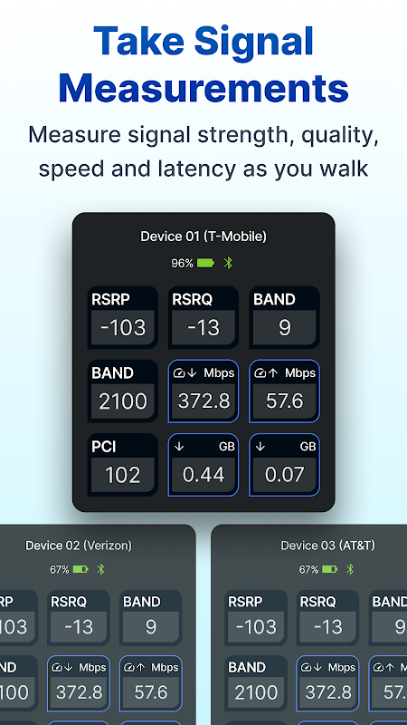 WalkTest membolehkan anda mengukur dan memetakan pelbagai jenis KPI selular, termasuk RSRP, RSRQ, SINR, kelajuan muat turun, kelajuan muat naik, kependaman, NCI, PCI, eNodeBID, jalur frekuensi, ID eNodeB dan banyak lagi.