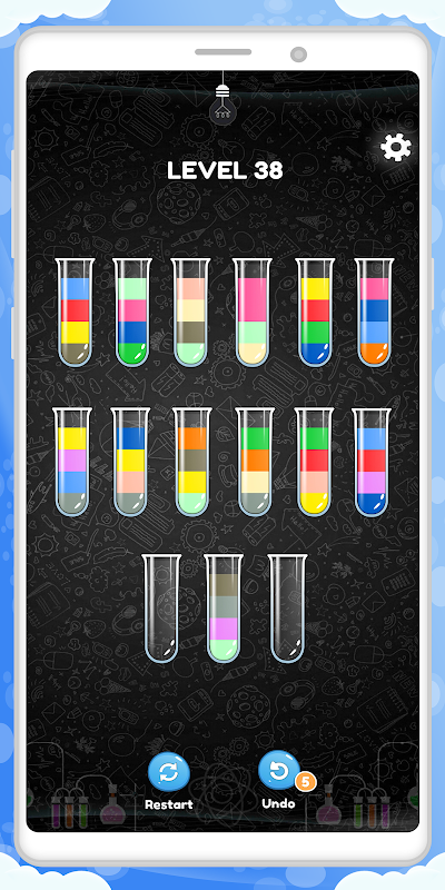 Tugas anda seterusnya ialah menyusun air berwarna dalam cawan sehingga semua warna dalam gelas adalah sama. Permainan ini mudah untuk dibiasakan, tetapi sukar untuk menjadi pakar dan terdapat 1000 teka-teki untuk mencabar anda.