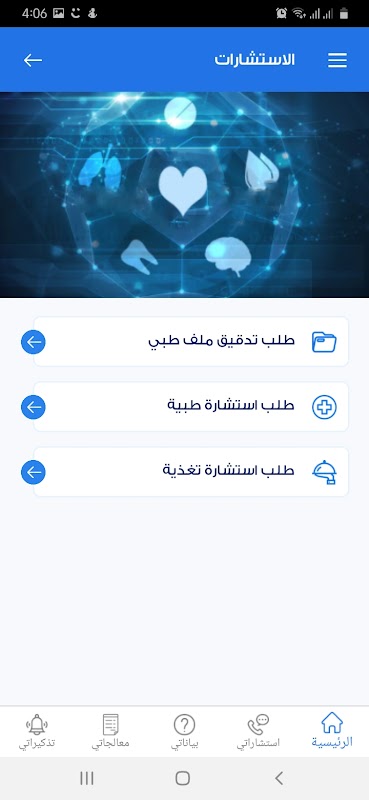 Aplikasi ini membolehkan pengguna melihat rekod perubatannya dan menghantar permintaan untuk nasihat perubatan