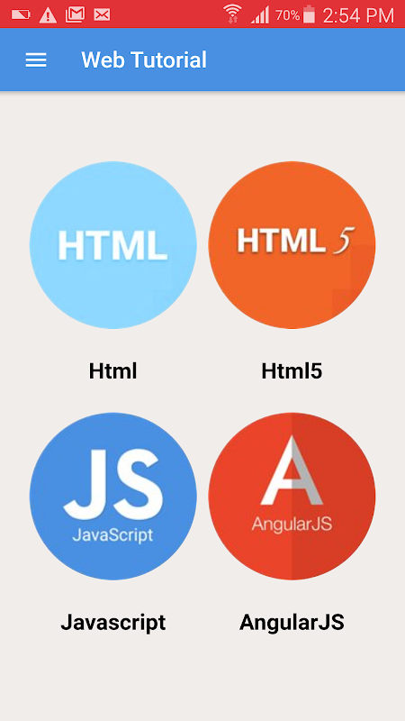 Dalam aplikasi ini juga mengandungi tutorial untuk HTML, HTML5, Javascript dan sudut JS.