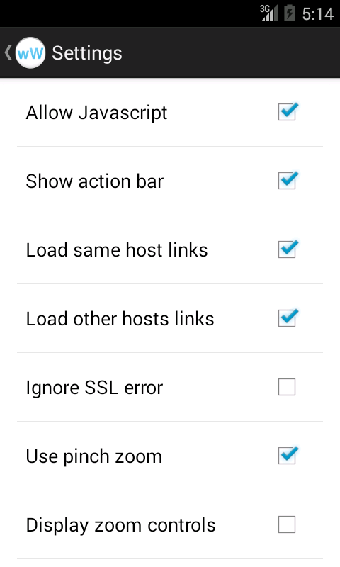 It supports backwards navigation for the web pages, loading indicator, error handling, some settings and remembers last visited URL.