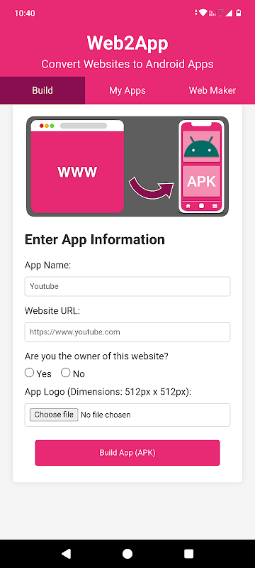 Selamat datang ke Web2App Pro: Tapak Web ke App Maker, penyelesaian anda untuk menukar tapak web dengan lancar kepada aplikasi Android dinamik. Dengan hanya beberapa klik, tukar kandungan web anda menjadi apl berkuasa yang sedia untuk diuji, dikongsi atau diterbitkan di Play Store dan App Store.