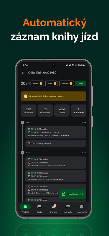 Aplikasi ini menyediakan maklumat terkini tentang status dan lokasi kenderaan dengan kemungkinan memaparkannya pada peta. Berdasarkan pergerakan kenderaan dan koordinat GPS, ia secara automatik merekodkan buku log elektronik, termasuk pembahagian kepada perjalanan perniagaan dan persendirian. Tambahan pula, aplikasi ini menyediakan rakaman kos - resit untuk mengisi minyak, mencuci atau menservis boleh dimasukkan dengan mudah ke dalam aplikasi dan kemudian dipindahkan secara digital ke perisian perakaunan anda. Akhir sekali, aplikasi itu membolehkan anda meninggalkan mesej untuk pengurus armada anda, penghantar atau pengguna kenderaan lain.
