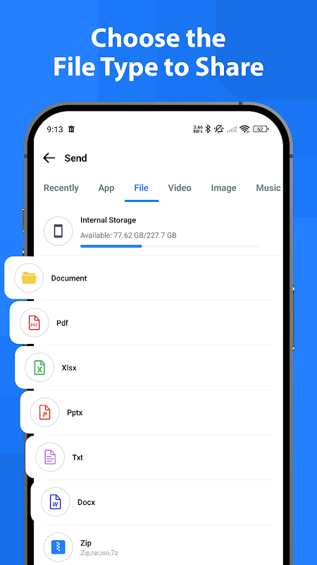 Pilih daripada apl, fail, video, foto dan audio yang disimpan pada peranti anda. Hantar tanpa kerumitan dan tanpa had saiz untuk format yang disokong.