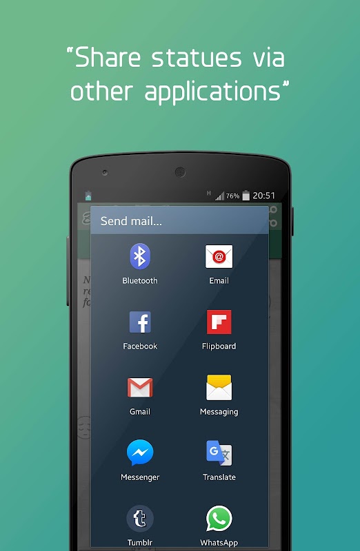 - Share statuses via other applications social (Facebook, whatsapp, twitter, tumbler .. )
