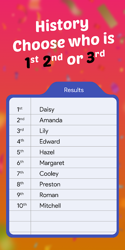 Buat keputusan kurang tekanan dan lebih menyeronokkan. Muat turun Wheel of Names hari ini, putar roda dan lihat di mana ia mendarat! 🎡