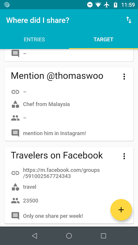 Plan your shares by adding targets (facebook groups, twitter accounts, instagram,...) and add useful information.