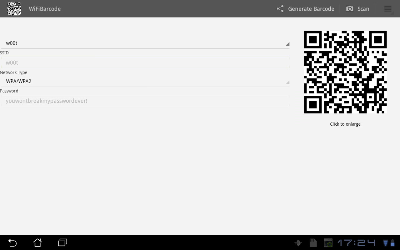 WiFiBarcode membolehkan anda berkongsi konfigurasi WiFi anda melalui Kod bar. Pengguna akar dapat berkongsi kata laluan WiFi juga!