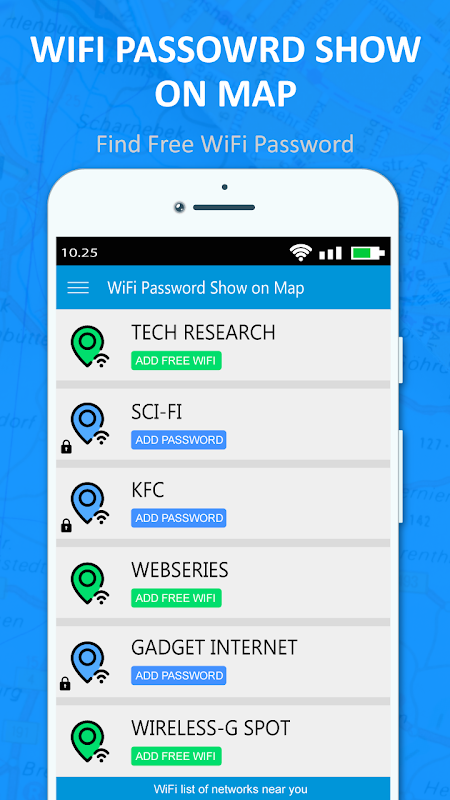 Peta Kata Laluan WiFi - Kata Sandi WiFi Tunjukkan di Peta adalah alat yang luar biasa untuk mendapatkan akses internet wifi percuma di seluruh dunia. Dengan Peta Kata Laluan WiFi, anda dapat bergabung dengan rangkaian Wi-Fi percuma, mencari rangkaian wifi dan bergabung secara automatik. Tidak masalah di mana anda berada, ini adalah kaedah terbaik untuk melayari internet secara percuma. aplikasi kata laluan wifi mengesan sambungan wifi berdekatan dengan anda. Sambungan internet percuma Wifi ini membantu mencari rangkaian WIFI, menyambung dan menguruskan hotspot wifi, anda boleh menyemak rangkaian wifi terdekat dan menghubungkannya dengan aplikasi sambungan Kata Laluan WiFi WiFi.