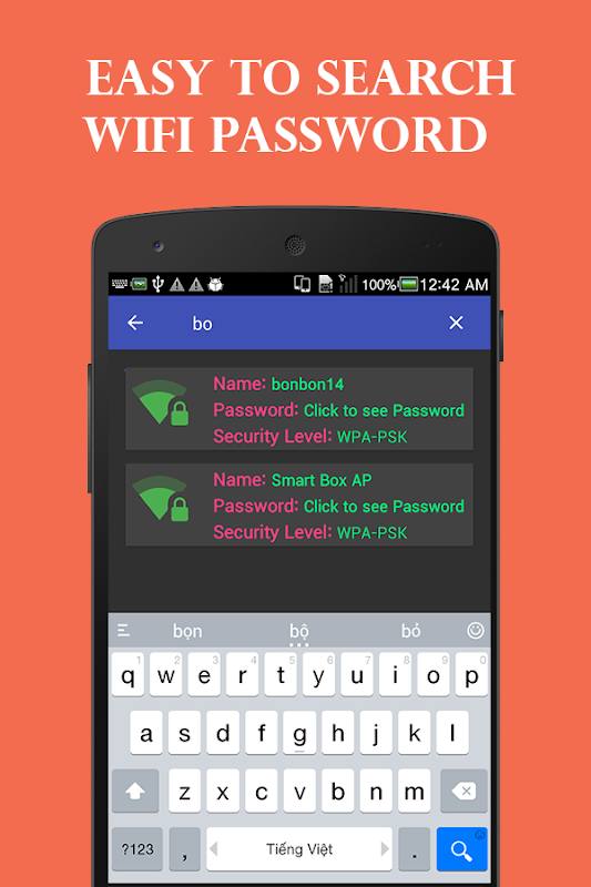 You need ROOT your device to use 'Wifi Password Viewer', you can copy your password to the clipboard to paste anywhere. Or you can share your wifi password in easy way.