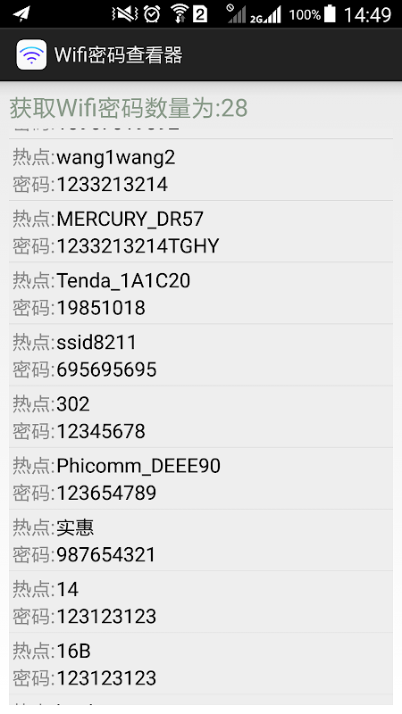 Root后读取当前手机已连接过的WIFI密码,文件仅40K,无需特殊权限,支持Wifi变化后更新,支持 Android 8.1