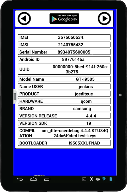 Permohonan ini adalah berguna untuk mengetahui jika anda adalah ROOT telefon pintar anda dan menunjukkan data maklumat dalaman, seperti IMEI, nombor siri, ID Android dan lain-lain .. sangat berguna dalam kes kehilangan atau kecurian.