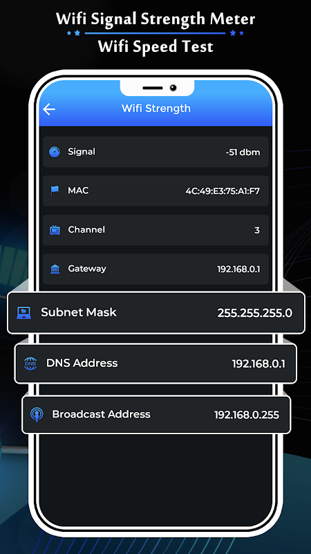 WiFi Signal Strength Meter - WiFi Speed Test app also provide option to change the BG from collection or also WIFI more details like Signal, MAC, Channel, Gateway, Subnet Mask, DNS address or also Broadcast Address. Just one touch to get the result of WIFI speed using this app.