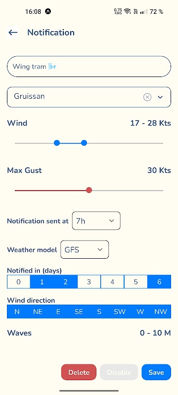 Tetapkan makluman tersuai berdasarkan tempat kegemaran anda, kelajuan angin, arah, saiz bengkak.