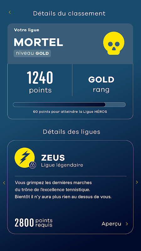 Ini ialah versi pertama apl yang dipermudahkan, dikurangkan kepada ciri menjemput rakan, mengatur perlawanan, memasukkan keputusan dan menjejak kemajuan anda dalam sistem kedudukan uniseks kami, yang menampilkan 8 liga berdasarkan mitologi Yunani dan empat peringkat setiap liga: Berlian, Emas, Perak dan Gangsa.