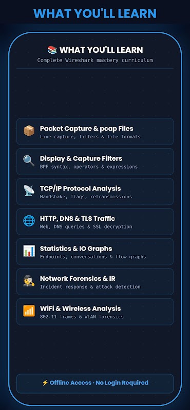 Tutorial Wireshark ialah aplikasi percuma paling lengkap untuk menguasai Wireshark dan analisis rangkaian dari awal. Sama ada anda seorang pemula atau profesional berpengalaman yang menyasarkan pensijilan CEH, OSCP dan keselamatan siber — aplikasi ini merangkumi arahan Wireshark, penghidu paket, analisis protokol dan trend keselamatan siber 2026 dalam bahasa anda sendiri, bila-bila masa, di mana sahaja.