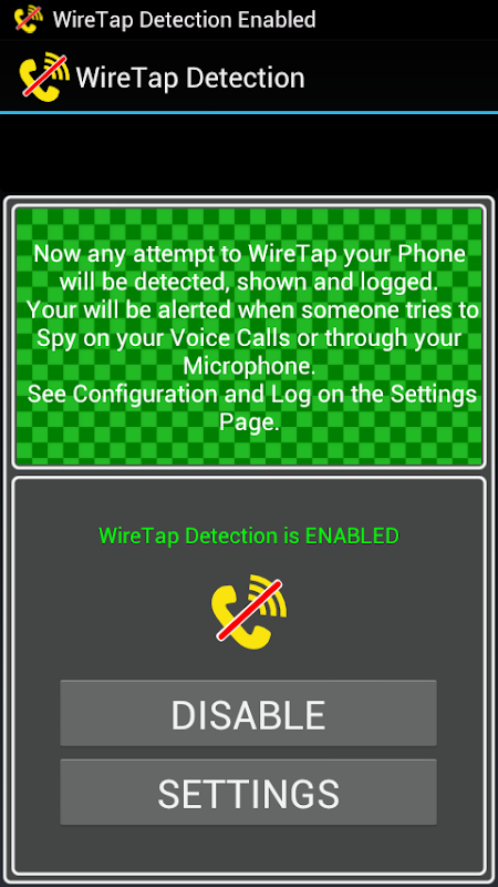 App ini - "Pengesanan sambungan telefon secara rahasia" - akan melindungi anda daripada pengintai dengan cara ini, oleh Mengesan semua percubaan untuk Ketik Telefon. Sebelum anda ingin membuat rakaman sendiri - atau VoIP (contohnya Skype) Panggilan - hanya menyentuh butang untuk mematikan App.