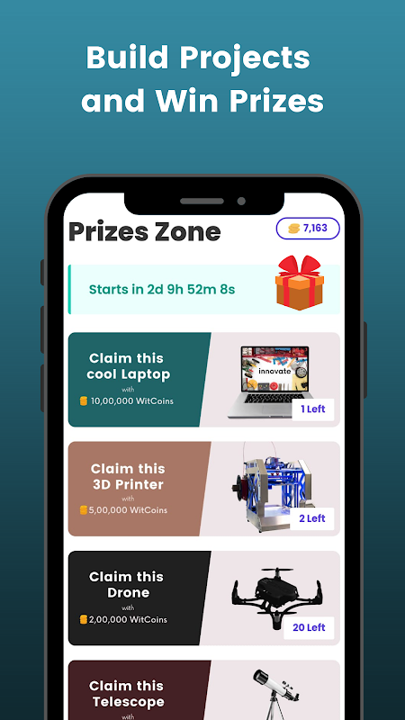 Anda boleh membina projek, memperoleh Witcoin dan memenangi hadiah seperti Komputer Riba, Pencetak 3D, Drone, Teleskop, dll.