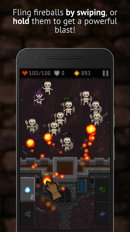 • Simple control! Fling fireballs by swiping, or hold them to get a powerful blast!